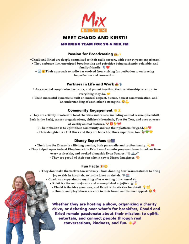 We are a morning show team that not only spends mornings together but 24 hours a day together as husband and wife!